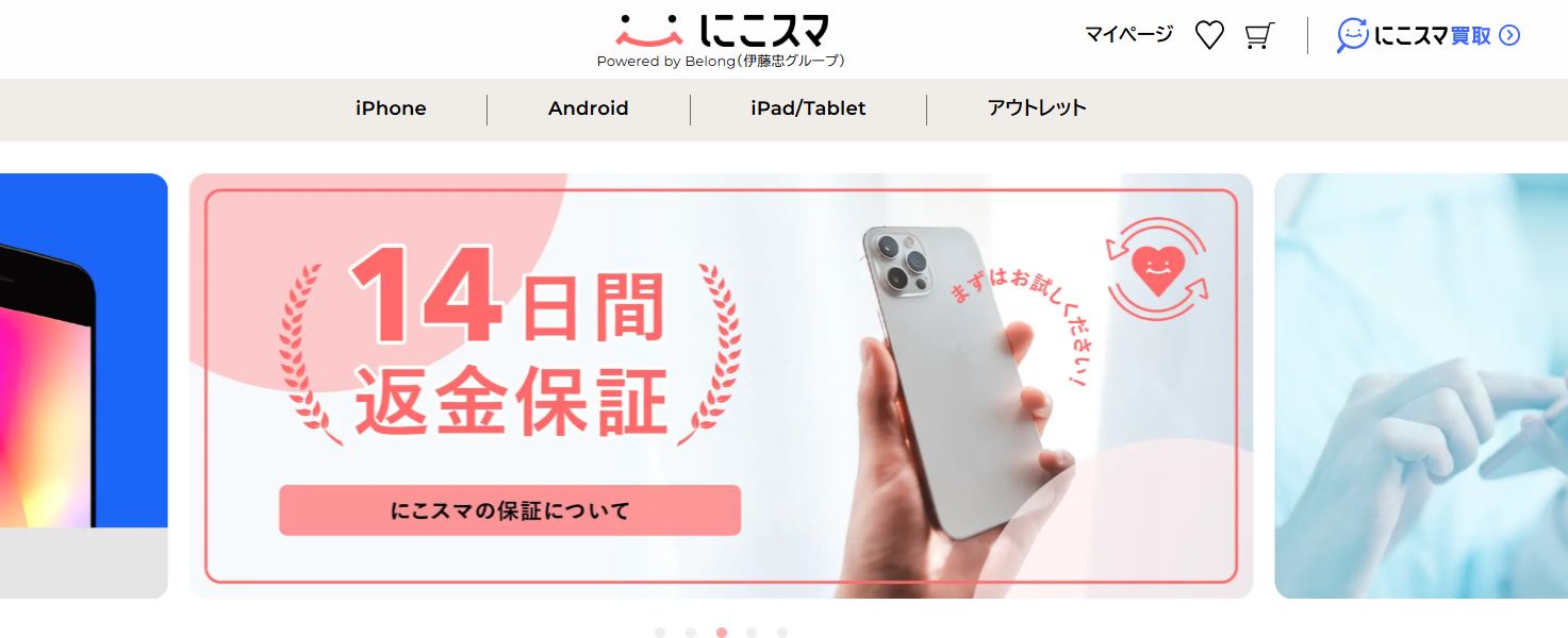 にこスマは、大手総合商社・伊藤忠商事の100%グループ会社「株式会社Belong」が運営する中古スマホの通販サービスです。